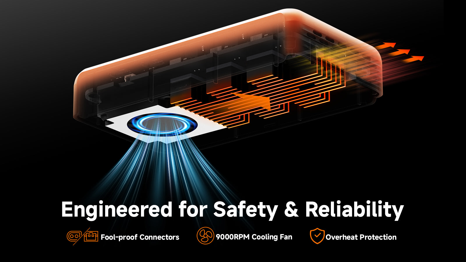 Пристрій оснащений яскравим 1.3-дюймовим кольоровим TFT-екраном. Ви бачите напругу, струм та статус кожного порту в реальному часі. Для захисту від перегріву використовується активна система: алюмінієві радіатори та інтелектуальний вентилятор на 9,000 об/хв.