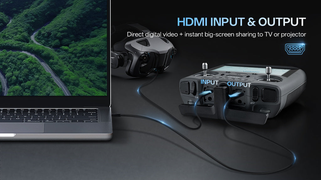 Наявність входу HDMI дає змогу виводити відео з цифрових систем безпосередньо на екран пульта. Окрім цього, через порт USB-C OTG та додаток DJI Fly можна транслювати живий відеопотік з окулярів DJI на дисплей AX12, що робить його ідеальним інструментом для спостерігачів або інструкторів.