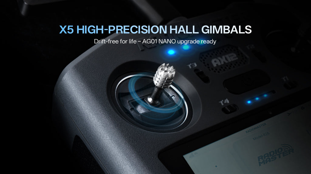 В основі AX12 лежать перевірені рішення RadioMaster. Пульт оснащений високоточними стіками X5 на датчиках Холла, які забезпечують плавність та довговічність експлуатації. Вбудований модуль ExpressLRS (LR1121) підтримує роботу на частотах 2.4 GHz або Sub-G 900 MHz, гарантуючи низьку затримку та стабільний зв'язок на великих відстанях.